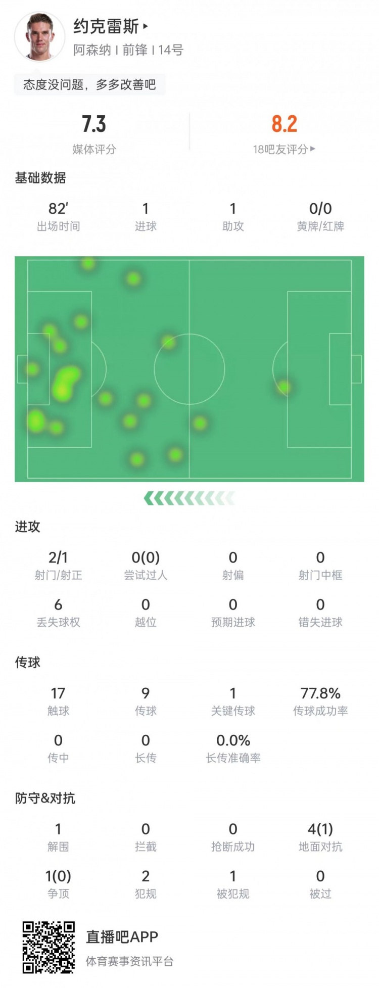 约克雷斯数据:2次射门打进1球,送出1记助攻,获评7.3分