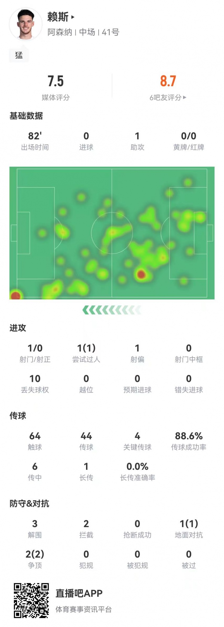 赖斯本场1助攻+4关键传球 3解围2拦截+3对抗3成功 获评7.5分